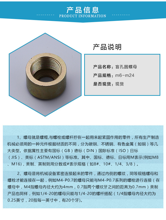 盲孔圓螺母是將機械設備緊密連接起來的零件,通過內側的螺紋,同等規格盲孔圓螺母和螺絲,才能連接在一起,例如M4-0.7的盲孔圓螺母隻能與M4-0.7的螺杆搭配(在盲孔圓螺母中,M4指盲孔圓螺母內徑大約為4mm,0.7指兩個螺紋牙之間的距離為0.7mm);美製產品也同樣,例如1/4-20的盲孔圓螺母隻能與1/4-20的螺杆搭配(1/4指盲孔圓螺母內徑大約為0.25英寸,20指每一英寸中,有20個牙)。