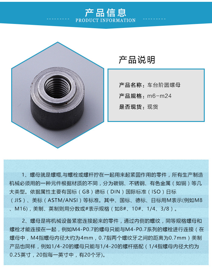 車台階圓螺母種類可以說是應有盡有,任何使用條件都有z合適的匹配車台階圓螺母。比如91免费下载安装熟知的一些車台階圓螺母:細杆螺釘連接車台階圓螺母、專用地腳螺釘用車台階圓螺母、六角車台階圓螺母、吊環車台階圓螺母、六角法蘭鎖緊車台階圓螺母、焊接車台階圓螺母、自鎖車台階圓螺母、圓車台階圓螺母、環形車台階圓螺母等等。而一些非常規的,可以91免费下载安装就不是很熟悉了,比如四爪車台階圓螺母、旋入車台階圓螺母、保險車台階圓螺母、扣緊車台階圓螺母、嵌裝圓車台階圓螺母、帶槽圓車台階圓螺母、側麵帶孔圓車台階圓螺母、端麵帶孔圓車台階圓螺母、蝶形車台階圓螺母等等。