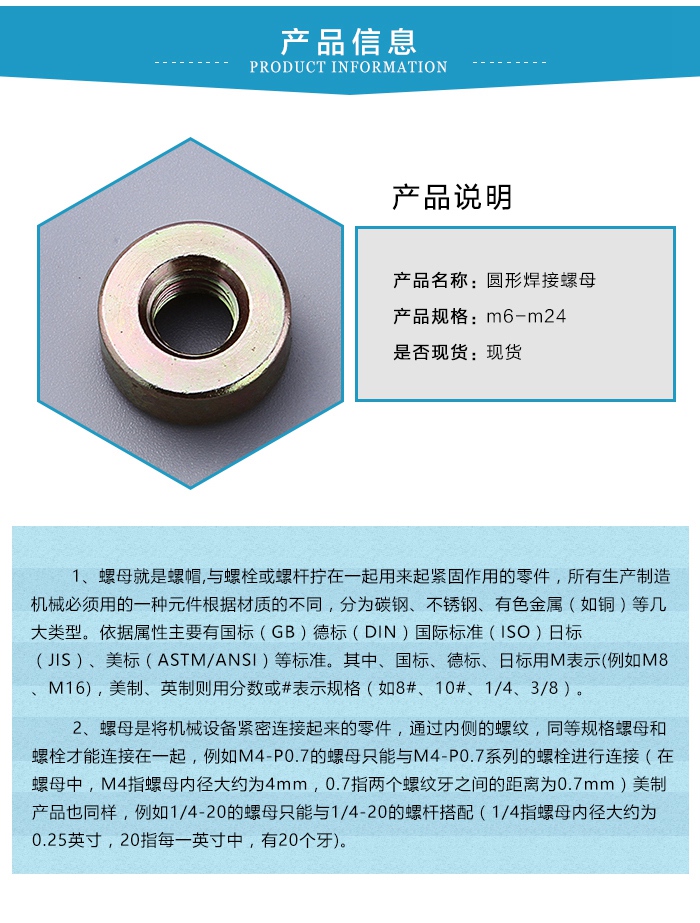 圓形焊接螺母被使用的範圍非常廣泛,是螺母中的一種,而且雖說焊接螺母的強度大,不易鬆脫,但在使用過程中還需要注意一些事項,以便焊接螺母連接使用。所謂焊接就是把兩個分離件變成一個整體,用高溫將金屬融化後混合到一起在冷卻,中間會加入合金,內部是分子力的作用,要比一般母體輕度大。
