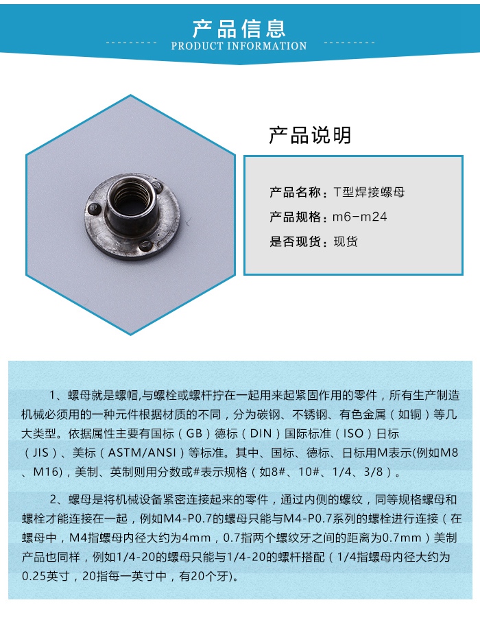 T型焊接螺母屬於焊接螺母中的一種,同樣的,應用範圍較為廣泛,而且T型焊接螺母的質量好壞的決定因素有很多,例如焊前表麵是否處理幹淨、是否有灰塵、油漬等。而且T型焊接螺母是一種在螺母外適合焊接的螺母,一般是可焊接的材料製成的而且較厚適與焊接,焊接是相當於把兩個分離件變成一個整體,用高溫將金屬融化後混合到一起再冷卻,中間會加入合金,內部是分子力的作用,強度一般比母體強度大[1] 。焊接參數的實驗要看焊縫的熔合大小,根據熔合大小調節焊接參數,直到消除缺陷。