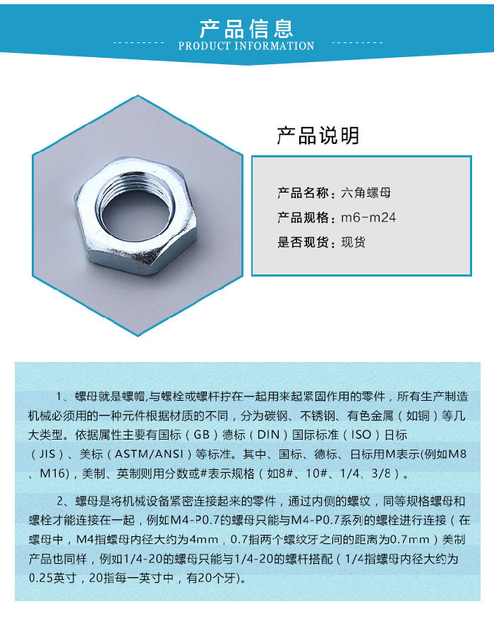91免费看毛片作為一種標準件,它就應當有自己的通用規格。91免费看毛片對於六角螺帽,常用的標準有:GB52、GB6170、GB6172和DIN934,對於它們之間的主要區別有:GB6170的厚度要比GB52、GB6172和DIN934來的厚,俗稱為厚螺帽。